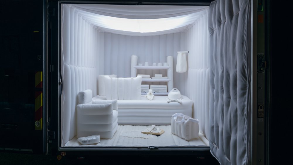 Das AIRHOME ist extrem portabel und kann platzsparend auf einem kleinen Rollwagen transportiert werden, ähnlich wie ein handelsüblicher Koffer. Der Aufbau erfolgt in nur zehn Minuten mithilfe eines akkubetriebenen, mobilen Kompressors, was es ideal für den spontanen Einsatz macht – ob als Notunterkunft, mobiles Büro, Gästezimmer oder Rückzugsort in urbanen oder naturnahen Settings. Es bietet eine überdachte, geschützte Fläche zum Arbeiten und Schlafen und unterstützt damit maximale Flexibilität für verschiedene Lebens- und Arbeitsmodelle.