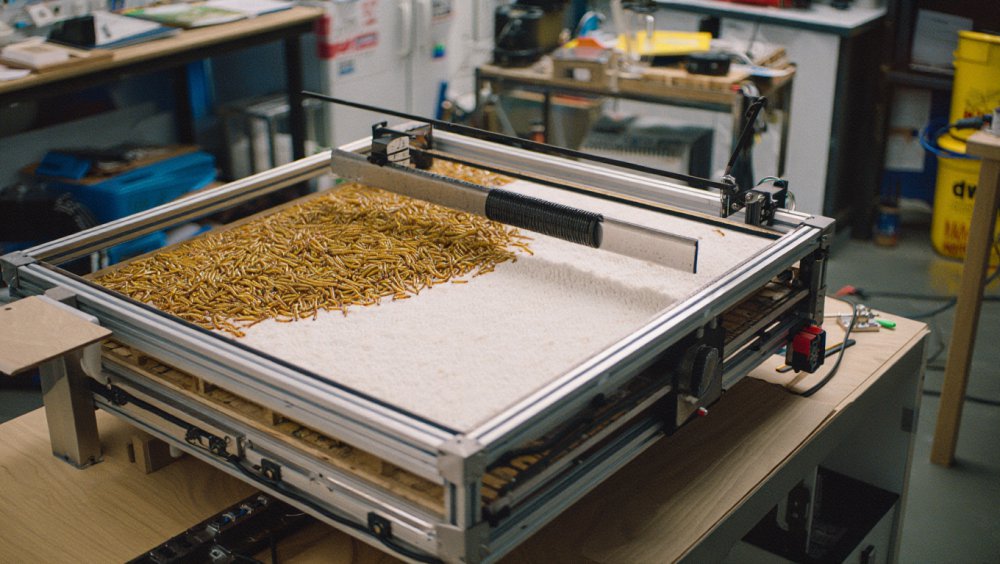 #1 Futterzufuhr: Ein automatisiertes System füttert die Maden mit geschreddertem Plastikabfall, möglicherweise angereichert mit Bindemittel-Vorläufern.