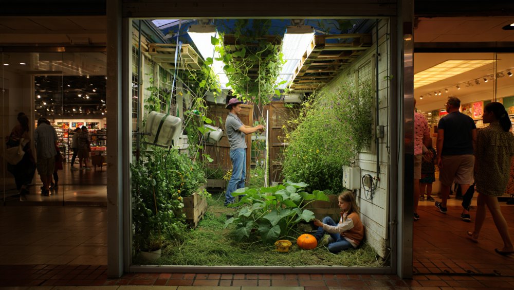 PARK INSIDE verwandelt ungenutzte Ladenflächen in Einkaufszentren zu ganzjährig nutzbaren Gemeinschaftsgärten und öffentlichen Parks. Durch das Verlegen von Rasenflächen, das Anlegen von Beeten und die Integration natürlicher Elemente entsteht ein geschützter Innenraum, der Menschen unabhängig von der Jahreszeit zum Gärtnern, Verweilen und Austauschen einlädt. Dieser Ansatz nutzt die bereits vorhandene Infrastruktur der Mall, um leerstehende Flächen neu zu beleben und einen sozialen Ort abseits des kommerziellen Konsums zu schaffen. Die Idee knüpft an die Tradition partizipativer Kunstprojekte wie Joseph Beuys' sozialer Plastik an, bei der Gemeinschaftsaktionen selbst zum Kunstwerk werden.