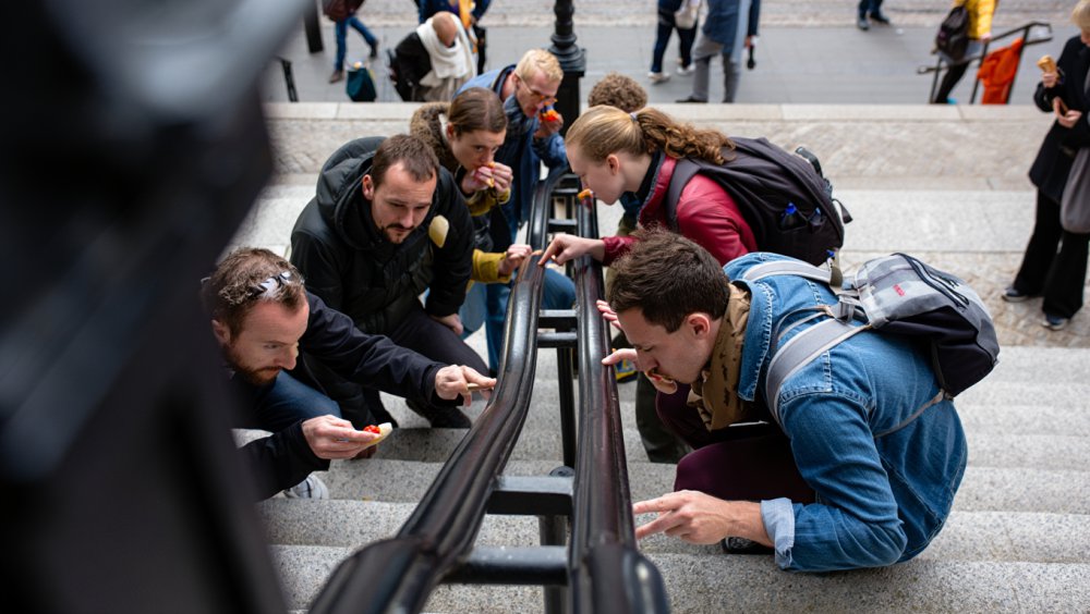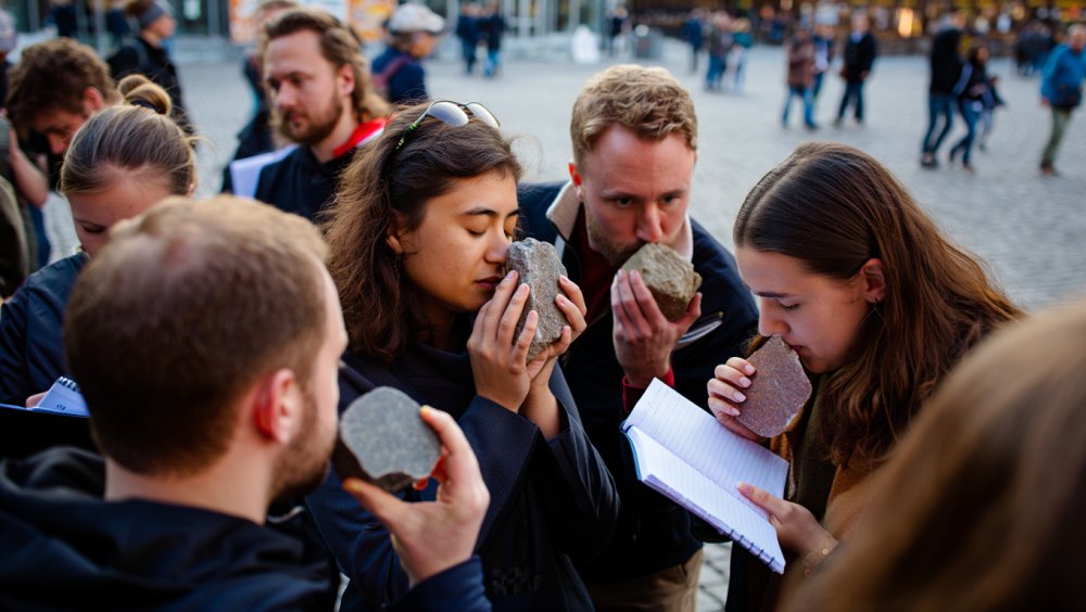 Ein Straßenpflasterstein, zum Verkosten eingeladen. Sein Geschmack erinnert an Regen, an Asphalt und Zeit. Ein Stück Stadt wird bewusst, naturnah auf der Zunge.