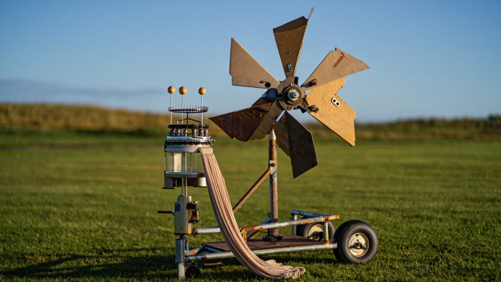 Ein transportabler Prototyp demonstriert die vollständig autarke Herstellung textiler Röhrenstrickwaren ausschließlich durch Windenergie – von der lokalen Wollverarbeitung bis zum fertigen Produkt. Die Maschinenreihe verbindet mechanische Effizienz mit ökologischer Nachhaltigkeit und künstlerischer Praxis und zeigt konkret, wie dezentrale, ressourcenunabhängige Produktion möglich ist.