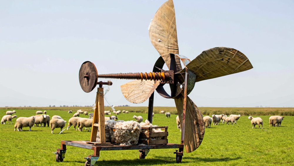 Die direkte mechanische Kraftübertragung von einer 3m-Windturbine zur Rundstrickmaschine bildet das Herzstück des Prozesses. Ein Schwungrad stabilisiert die unregelmäßige Windenergie, um kontinuierliche Produktion zu ermöglichen. Der Prototyp ist mobil auf windexponierten Flächen wie Deichen oder Freiflächen aufstellbar und umfasst den vollständigen Prozess im Kleinmaßstab: von der Schur über Grobreinigung, Spinnen und Stricken bis zur Endreinigung.